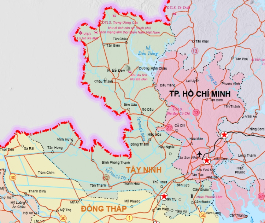 - Vị trí chiến lược: Tây Ninh nằm ở Đông Nam Bộ, là cầu nối giữa cao nguyên Nam Trung Bộ và đồng bằng sông Cửu Long, giáp TP. Hồ Chí Minh, Bình Dương, Bình Phước, Long An, và có 240 km đường biên giới với Campuchia (tỉnh Svay Rieng và Kampong Cham). Điều này giúp Tây Ninh trở thành cửa ngõ giao thương quốc tế quan trọng, đặc biệt qua cửa khẩu quốc tế Mộc Bài, nằm trên tuyến đường Xuyên Á.